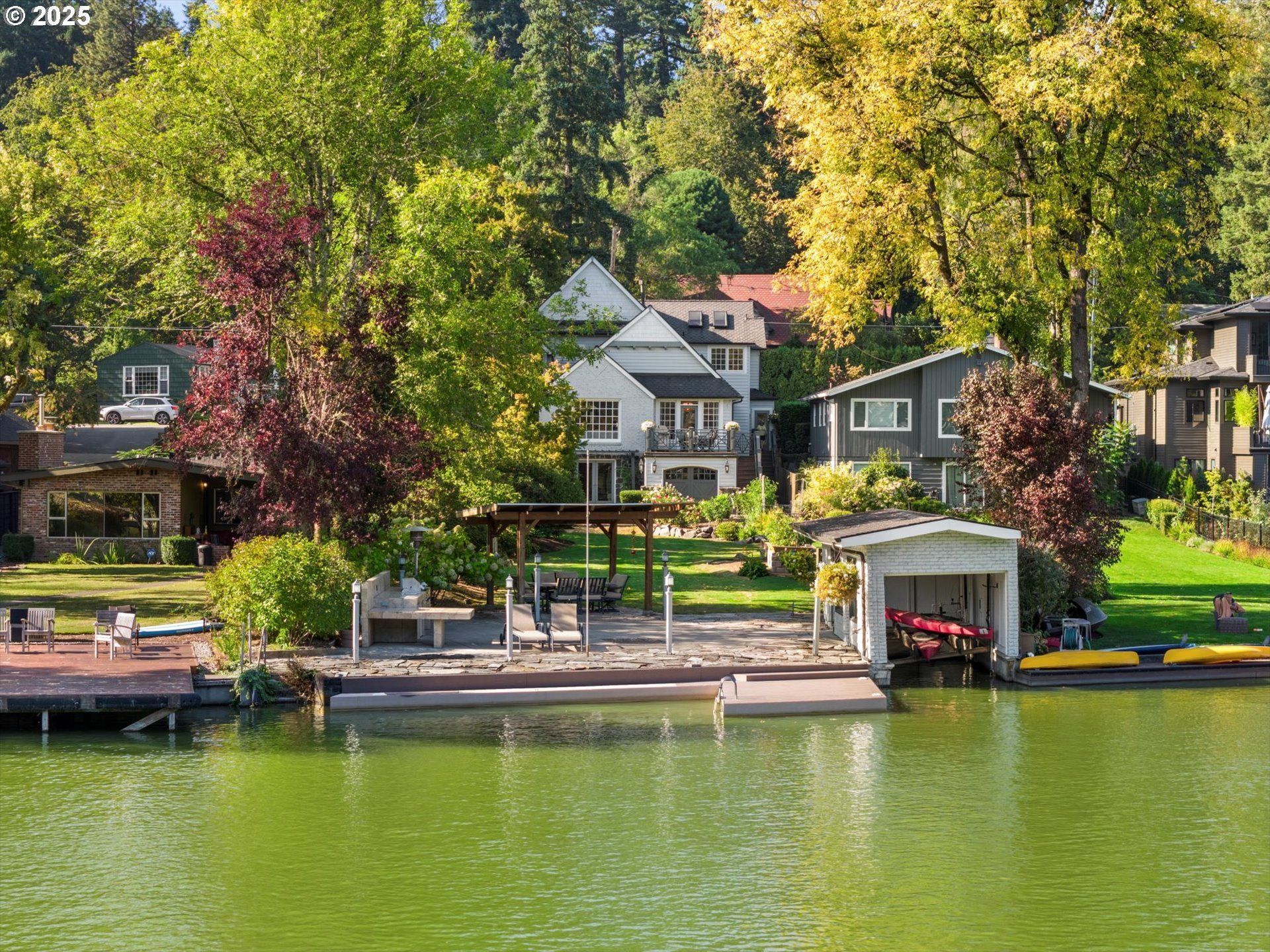 A Spring/Summer Oswego Lake opportunity! Located on the calm and serene Oswego Lake's West Bay with commanding southern exposure. This warm and comfortable traditional lives very easily with a flexible floor plan and a large, flat waterfront lot. For the price, this home offers a lot of square footage; large gourmet kitchen with Sub Zero, Viking and Miele appliances, great room, flexible formal or informal dining areas, four gas fireplaces including two enormous wood burning stone fireplaces from the original structure, large main floor multi use office with beautiful built-in bookcases and cabinets. Oversized Owner's Suite with walk in closet, sauna, vaulted ceilings, fire place, patio and optional gym or office area; recreation room with walk in wine cellar, 2 guest rooms and a potting room or flexible space with a roll up door to access the back yard. Long, level, backyard, raised garden beds, waterfront patio and boat house. Live that Lake Life all year long! This home provides close proximity to Zupan's, a variety of restaurants, coffee shops and services.