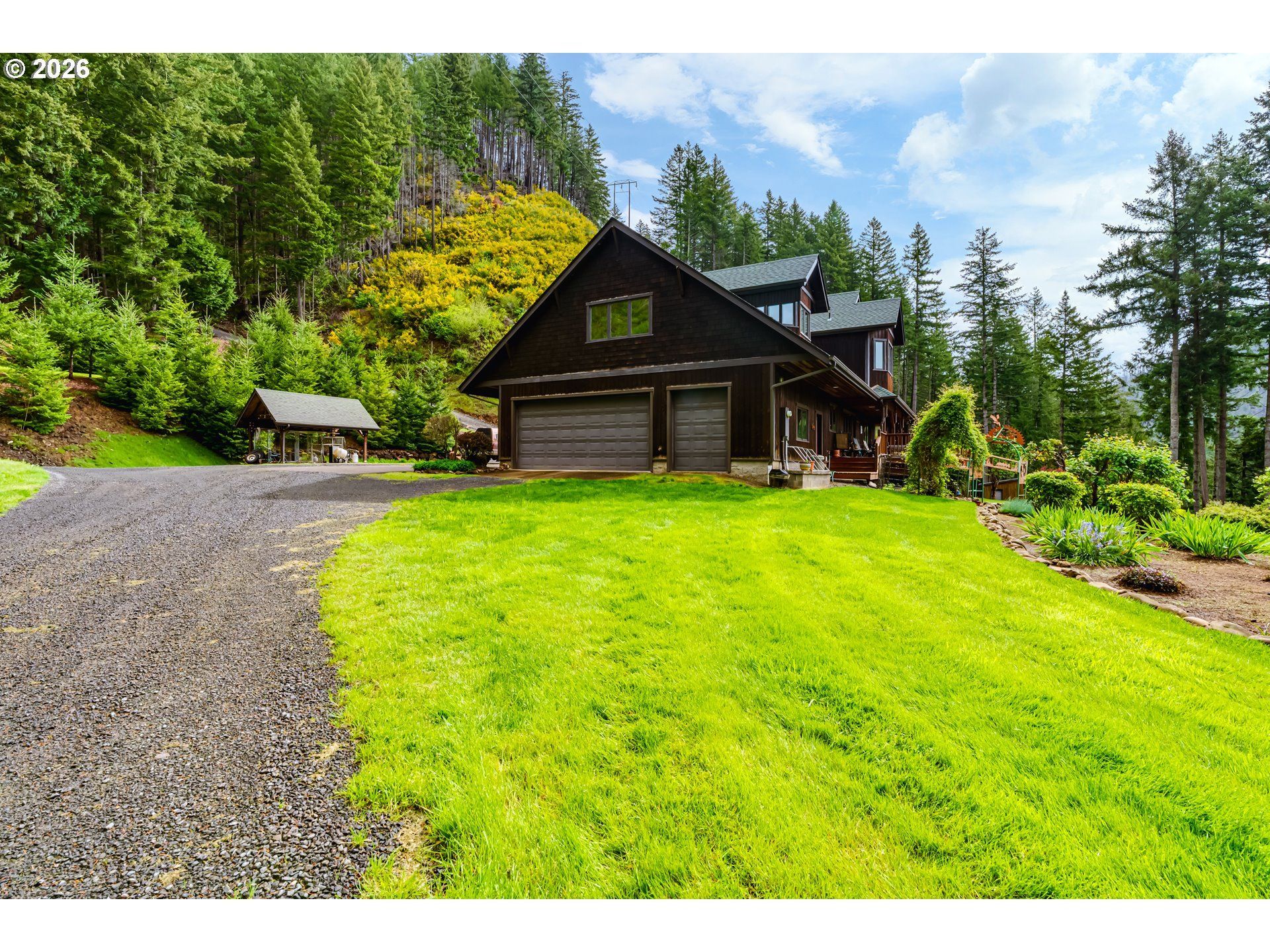 One-owner, custom-built lodge-style home offering 3,753 sq ft of living space on 36.95 private acres in the scenic McKenzie Valley. Designed with a flexible floor plan, this home features a stunning great room with soaring vaulted ceilings, skylights, and a full entertainment system-perfect for gatherings.The open-concept kitchen showcases abundant cabinetry, a full pantry, gas range, and an overlooking mural. The spacious main-level primary suite includes a large walk-in closet, walk-in shower, and direct access to the deck, where you'll find a built-in hot tub for relaxing among nature. A main-level office or optional fourth bedroom adds versatility.Upstairs offers two generously sized bedrooms, each with walk-in closets, along with a large game room featuring extensive storage-ideal for entertaining or hobbies.Outdoor living shines with approximately 1,000 feet of covered decking, breathtaking river views, and a peaceful, park-like setting. The property includes three sheds, a large, fenced garden area, and covered RV parking. A lower area with a beautiful water feature creates a private retreat reminiscent of your own camping getaway.Additional highlights include marketable timber, a seasonal creek and waterfall, pond, and three historic mining sites. A truly exceptional opportunity to own a private retreat in the heart of the McKenzie Valley.